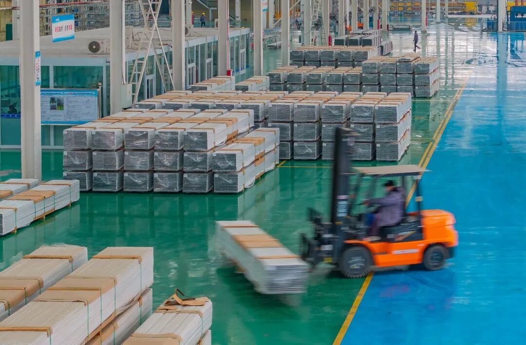 天门经济开发区,湖北立铭铝业科技有限公司的工人在装卸产品出库(柯皓|摄)
