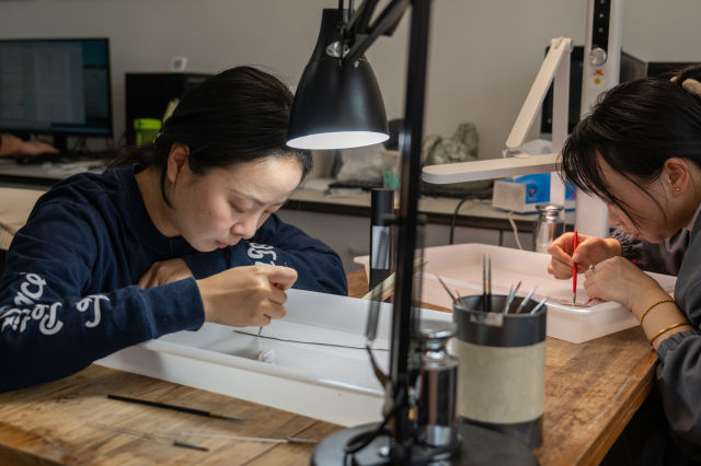 1月9日,在湖北荆州文物保护中心,荆州文物保护中心副主任吴昊(左)与父亲吴顺清查看近期正修复的虎座鸟架鼓。 新华社记者 杜子璇 摄