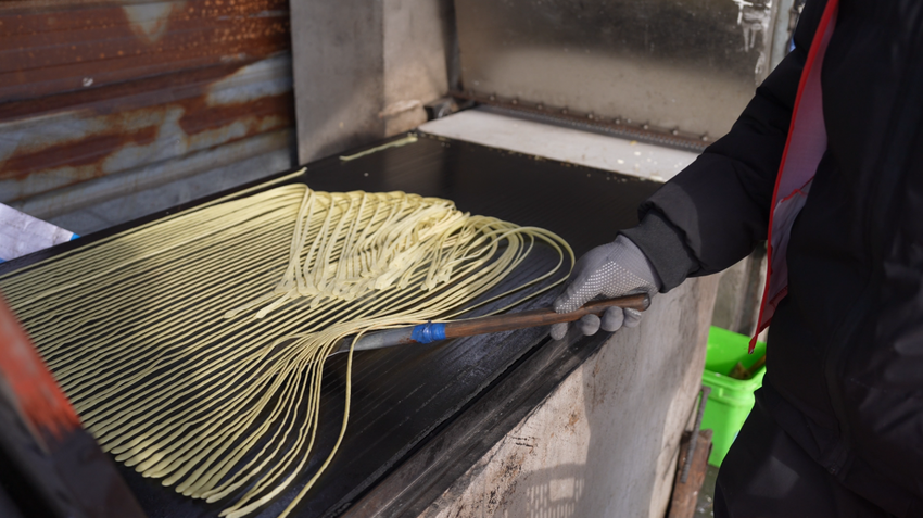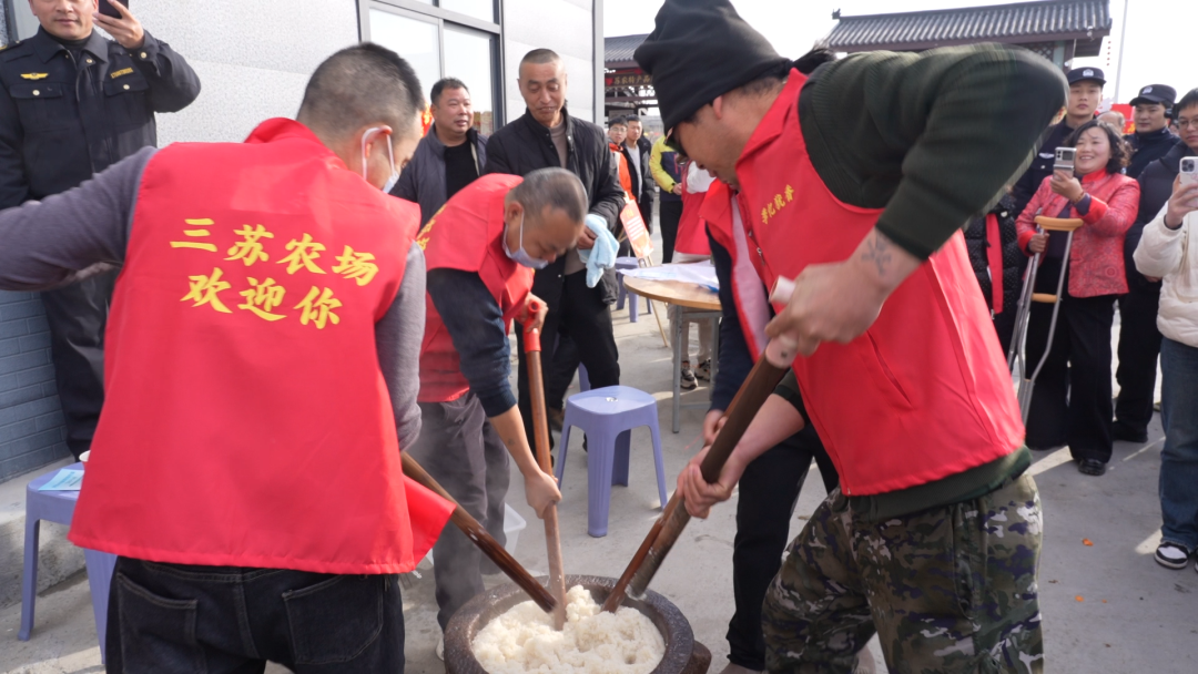 冬日暖阳下,季店乡阳光村三苏家庭农场热闹非凡。木槌捶打糯米的“咚咚”声与游客的欢笑声交织,蒸汽缭绕的糍粑现场成了人气最旺的“打卡点”。不少游客纷纷上阵,体验手工制作传统美食的乐趣。一旁的手工豆丝作坊也围满了人,从摊浆到切丝,每一道工序都吸引着游客驻足拍照。