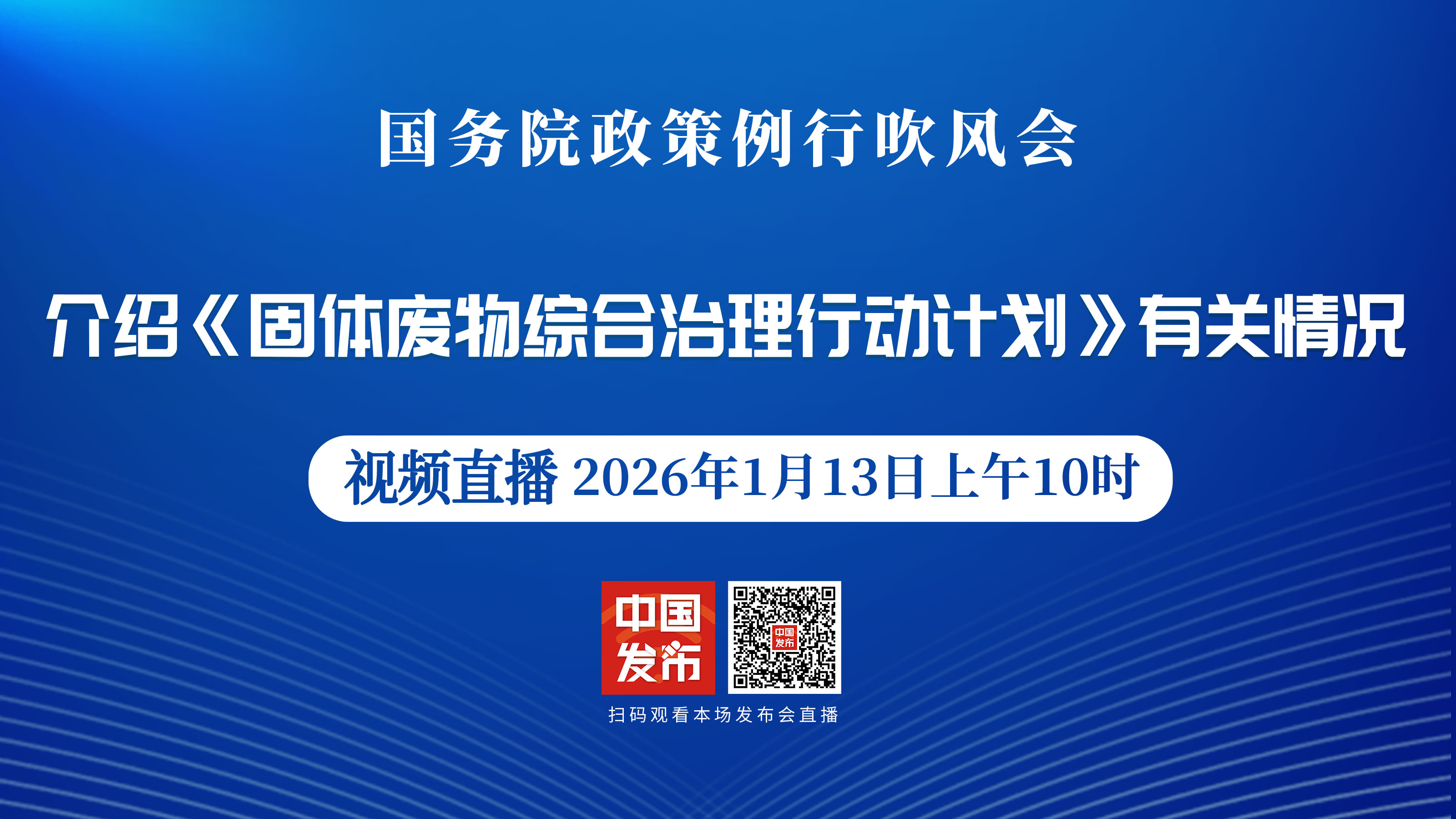 国务院新闻办公室于2026年1月13日(星期二)上午10时举行国务院政策例行吹风会,请国家发展改革委副主任周海兵、生态环境部副部长李高和工业和信息化部、住房城乡建设部、农业农村部有关负责人介绍《固体废物综合治理行动计划》有关情况,并答记者问。