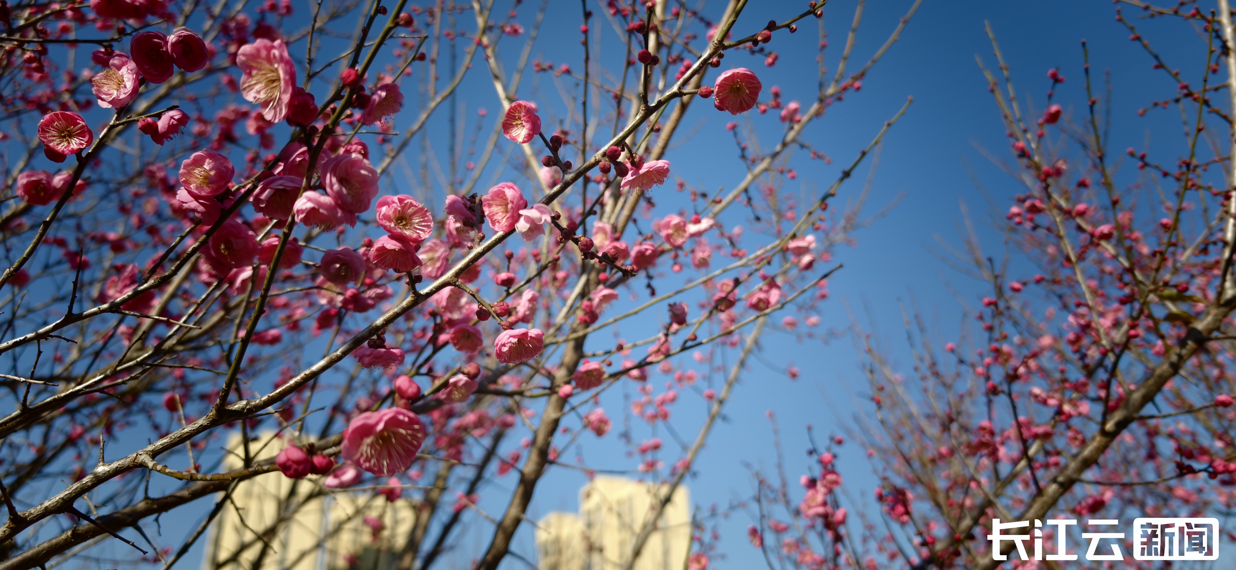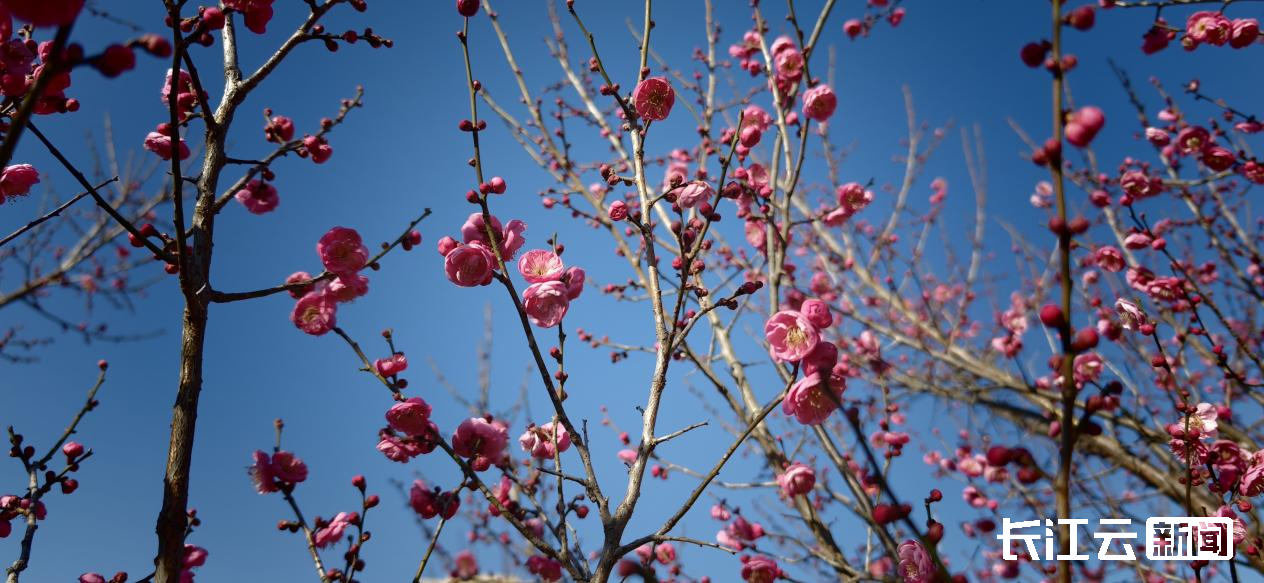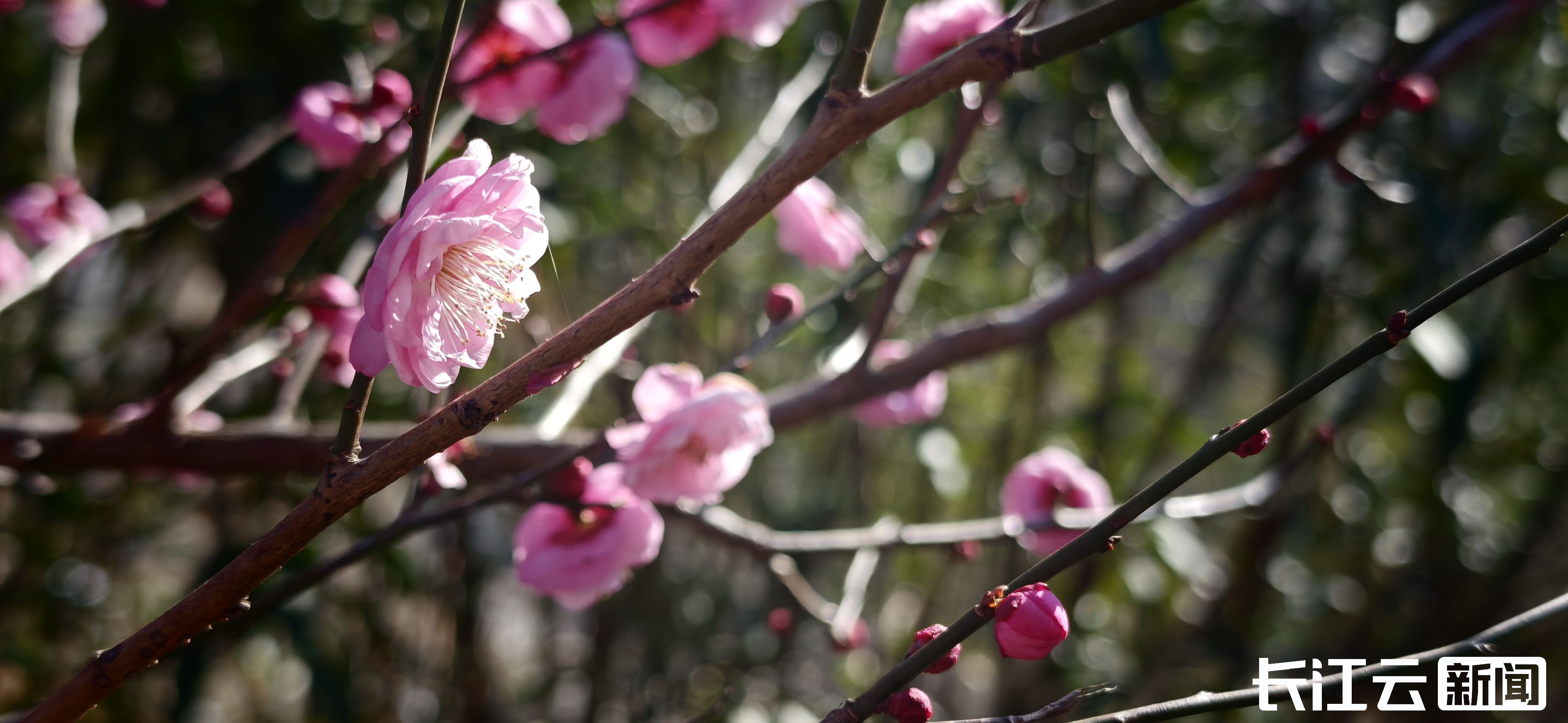 在高速路口红梅园,梅树舒展虬曲枝干,梅花粉瓣如胭脂轻染,白蕊似新雪初凝,在晨光中交织成流动的云霞,成为市民游客打卡的“早春顶流”。