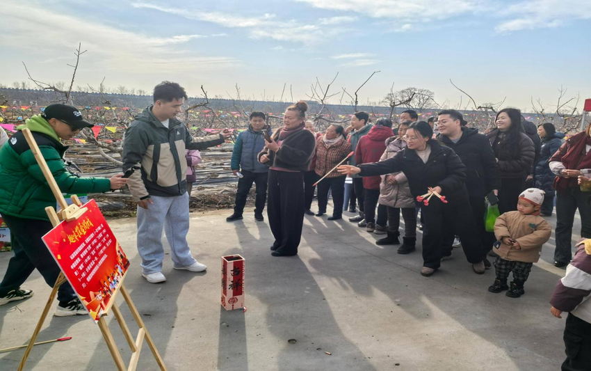 趣味投壶游戏区传来阵阵喝彩。参与者手持玉米棒芯,瞄准陶罐投入,中奖者喜获甘蔗、土鸡蛋、糍粑、豆丝、土鸡等特色奖品,欢笑声不绝于耳。农场年货展销区更是琳琅满目,土鸡、豆腐、腊味、咸菜等三苏农产品整齐陈列,明码标价,不少游客驻足选购,直播展销也同步进行,通过线上线下联动,拓宽了销售渠道。