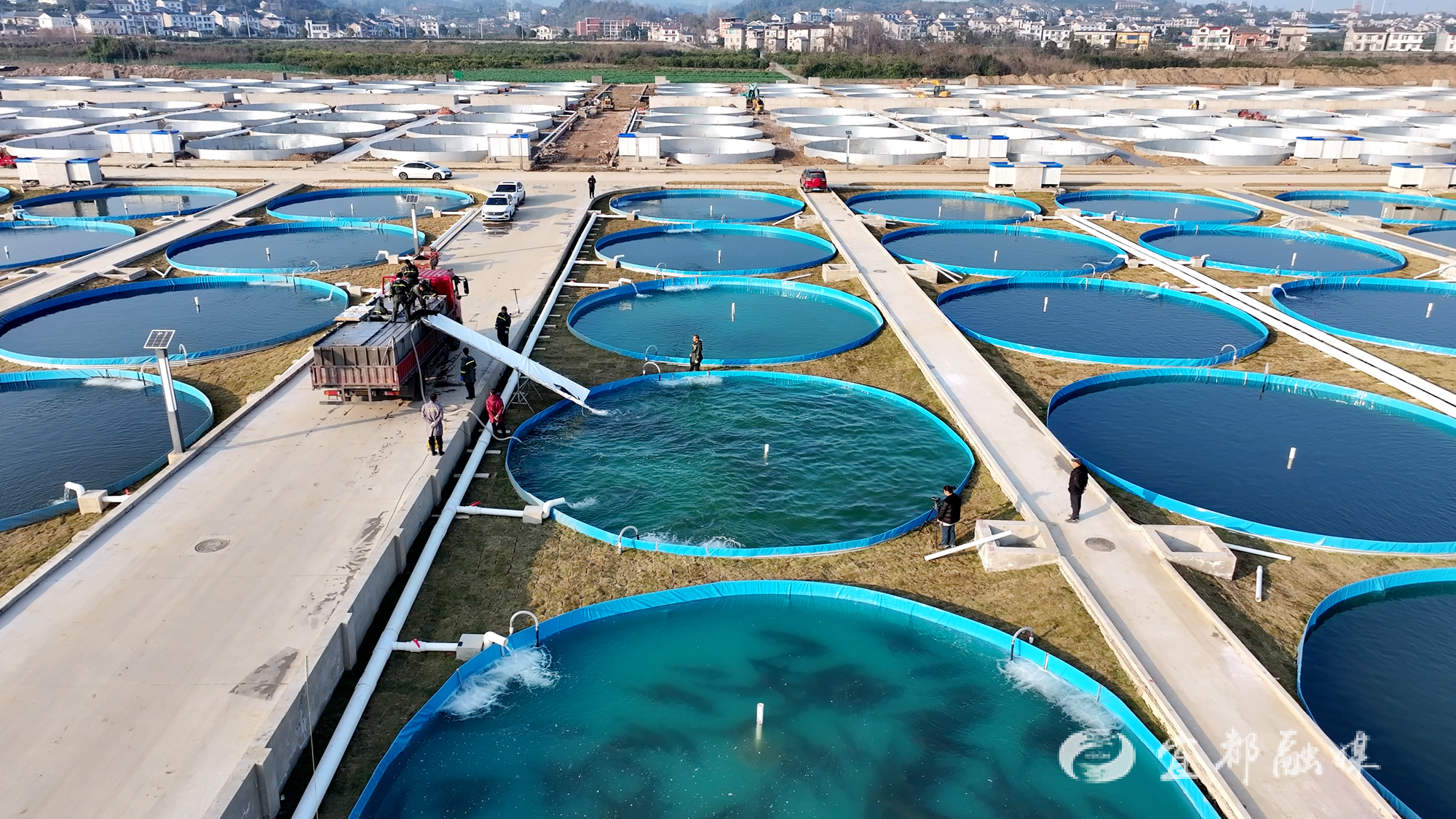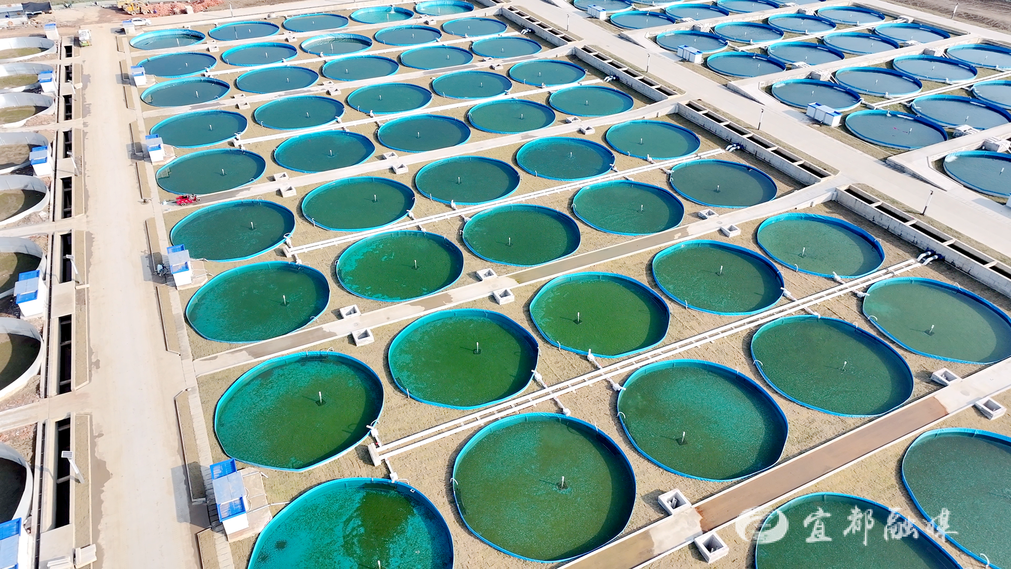 走进清江鲟鱼谷二期项目现场,442个直径14米、深2.4米的圆形鱼池整齐有序排列,部分鱼池已经投产使用。