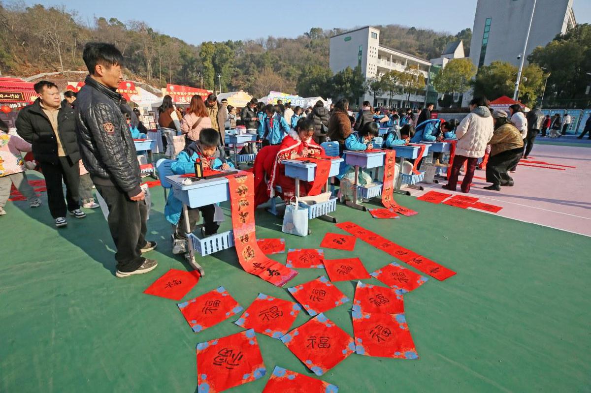 黄石五中、有色小学的师生还在现场设置了“写春联送福字”专区,笔墨挥洒间,一副副寓意吉祥的春联、一个个饱满圆润的“福”字新鲜出炉,免费赠送给参观者。