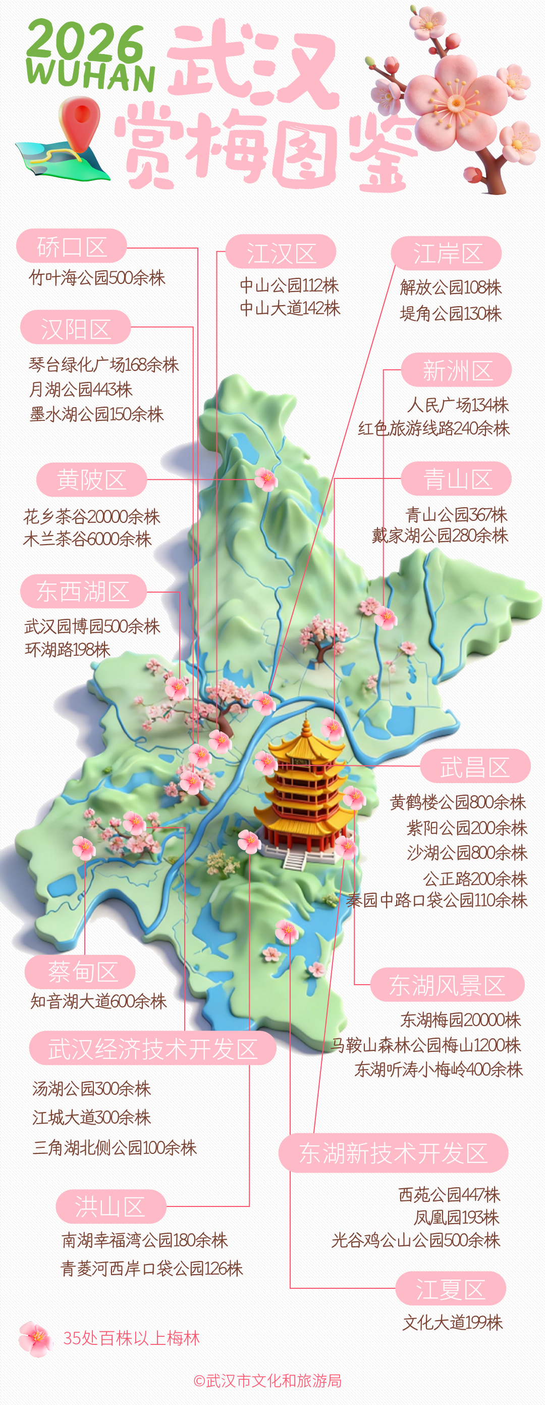 ○武汉35处百株以上梅林打卡地图,点击可保存大图(数据来源/武汉市园林和林业局)