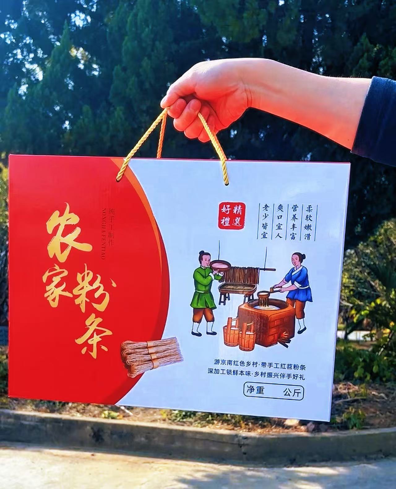 为了让红薯粉丝更好地走向市场,黄朝盛参考网络资料,结合京南村的地域特色设计了包装礼盒,简约大方的包装上印着“农家粉条”的字样,既突出了产品卖点,又便于储存和馈赠。