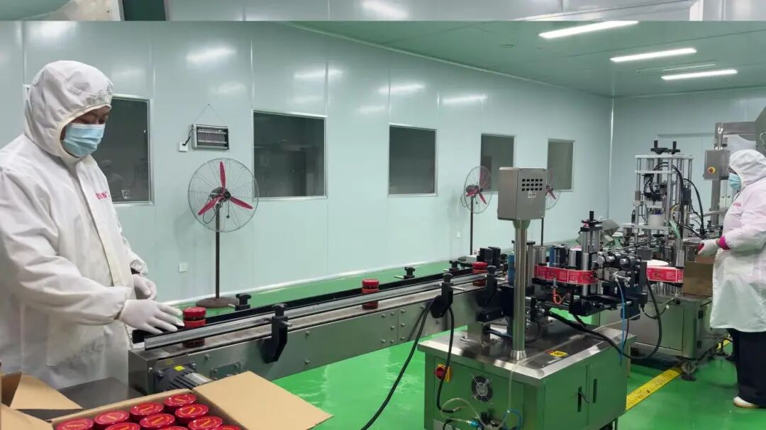 生产车间内,全自动生产线高效运转。进料、罐装、旋盖、贴标等工序一气呵成。