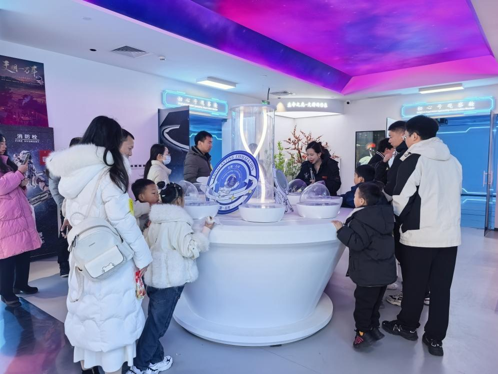 体验活动最吸睛的环节,莫过于VR大空间沉浸式体验。亲子家庭佩戴上VR设备,瞬间“穿越”时空。跟随数字人“小北”和“小武”的脚步,直接“踏入”了数字复原的古代农业社会场景。在AI技术驱动的场景中,孩子们得以亲手体验插秧、参与模拟科举,在高度交互的剧情里直观理解历史与文明。这种将前沿科技应用于人文历史的展示方式,让知识变得可触摸、可互动。体验结束后,所有家庭共同参与了太空主题冰箱贴手工制作,在温馨的协作中固化探索的乐趣与收获。