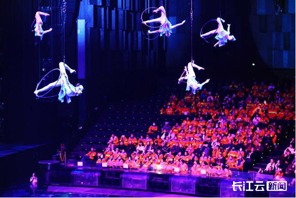 随着灯光渐暗、音乐响起,绚丽的水幕自舞台中央升腾而起。演员们以高超的特技与深情的表演,将一段段融合地域文化与艺术想象的故事娓娓道来。台下,环卫工人们凝神观看,目光随剧情流转,不时报以热烈而持久的掌声。“我在这片区域扫了九年大街,经常在剧场外围做保洁,听见里面的音乐声,但从没进来过。”来自武昌区的环卫工人代表张燕说道,“今天终于有机会走进来,坐下来好好看一场演出,心情特别激动。”从城市的“清洁守护者”到剧场的“特邀观众”,这不仅仅是一次身份的转换,更是城市为平凡星光点亮的舞台,是一次温柔而有力的社会回响。武汉市武昌区政协委员、汉秀剧场总经理方沛也表示,邀请环卫工人走进剧场,是我们践行社会责任、推动文化共享的实际行动。艺术应当属于每一位城市守护者,我们希望借此传递城市的温度与谢意。