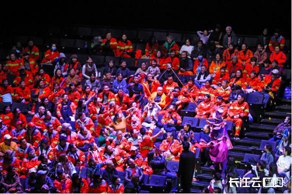 1月14日晚,汉秀剧场迎来一批特殊的客人——600名来自武昌区、洪山区的一线环卫工人作为首批受邀代表集体出席观演。活动现场开设环卫工人专用通道,并安排工作人员全程引导,保障入场有序、体验舒适。许多环卫工人表示,这是人生的“第一次”剧场体验,心里既感新鲜又充满期待。活动还特别设置集体合影环节,环卫工人们并肩而立,笑容腼腆而灿烂,这温馨难忘的时刻被镜头永久留存。