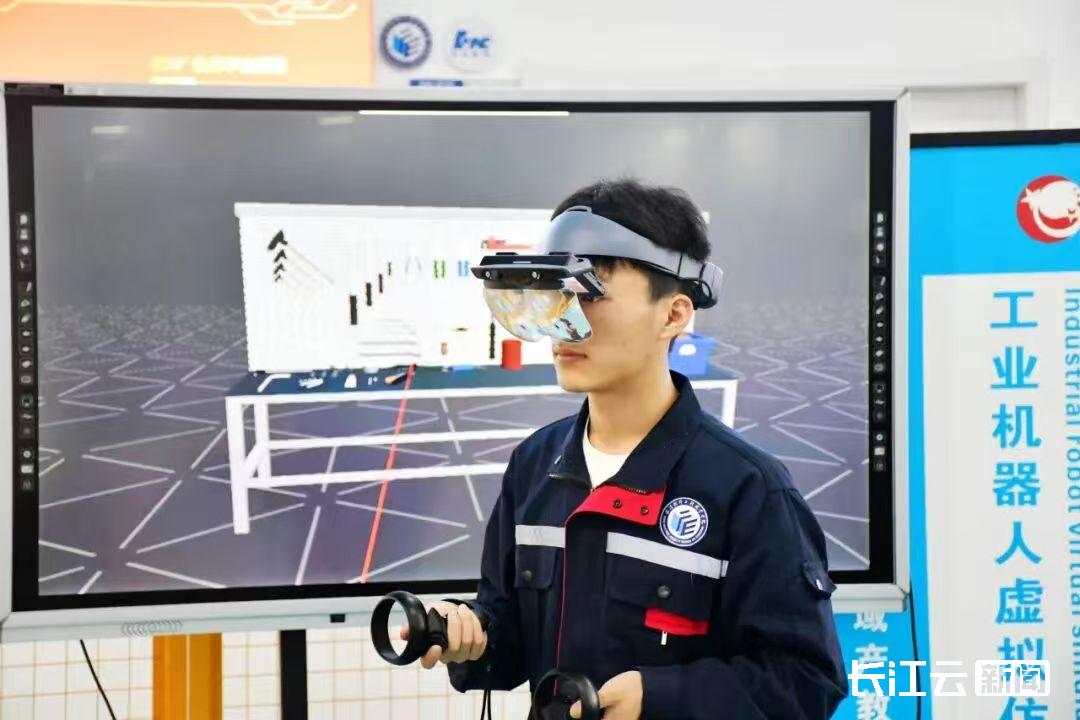 ▲武汉软件学院学生用VR设备学习智能制造