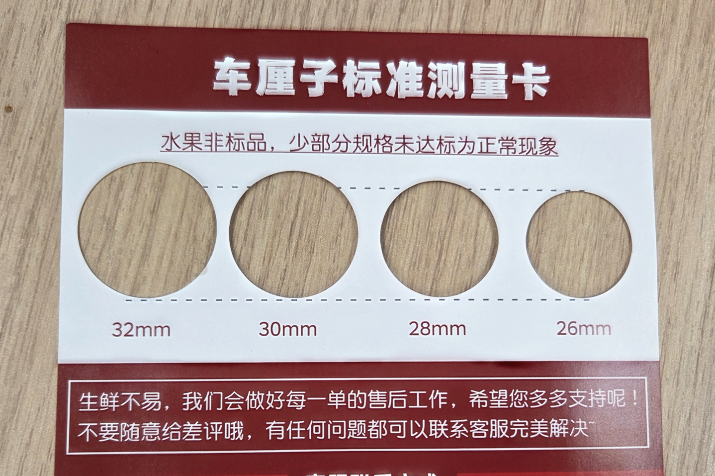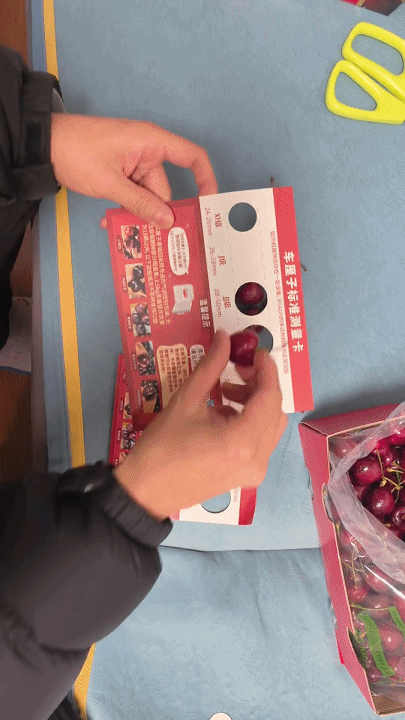其附带的果径卡虽标注32毫米孔洞,实测尺寸符合标准,且车厘子通过了卡片自测。