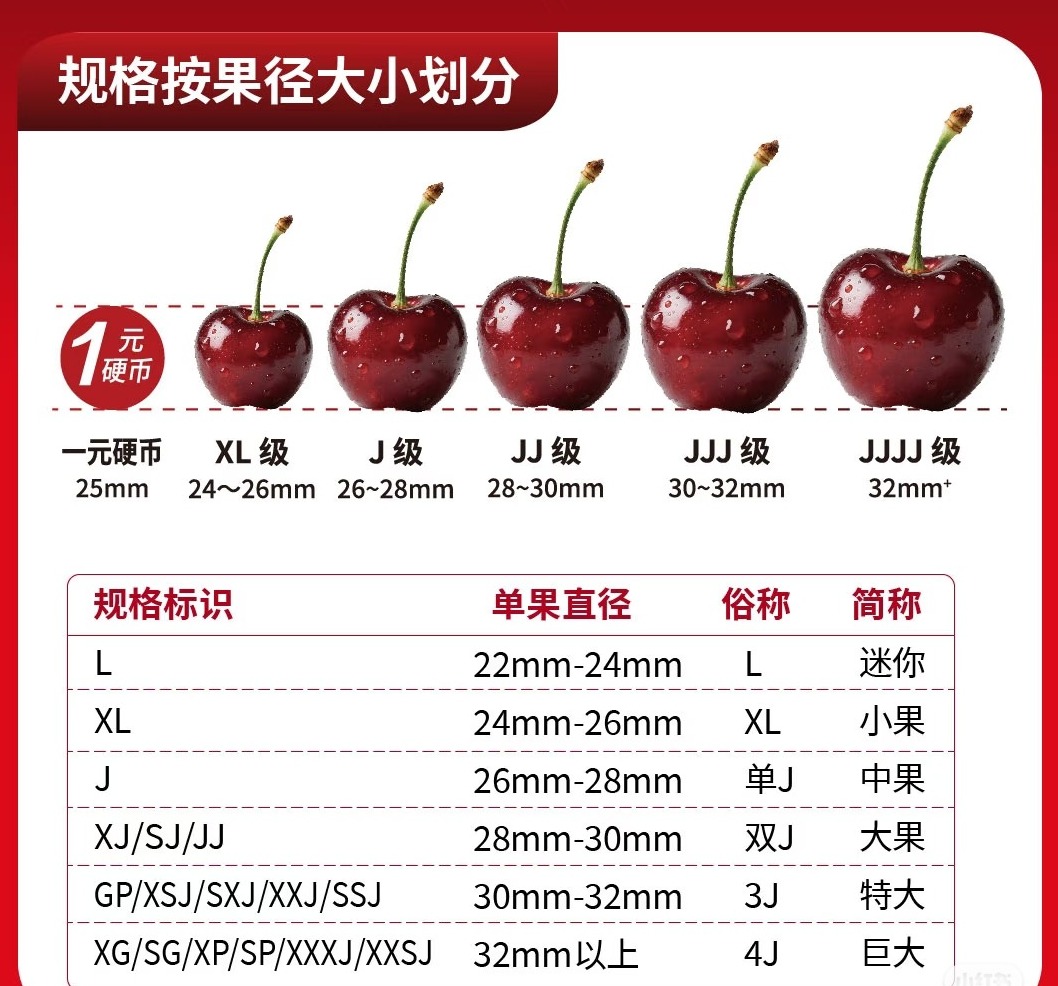 产品标签中的“J”,是南半球产区(如智利、澳大利亚)通用的果径大小标准。J数越多,个头越大,价格越贵。GB/T26906-2024《甜樱桃》的国标对于每种品级的车厘子大小有明确规定。