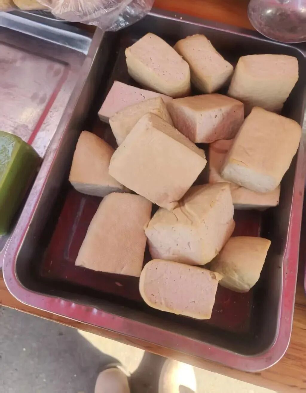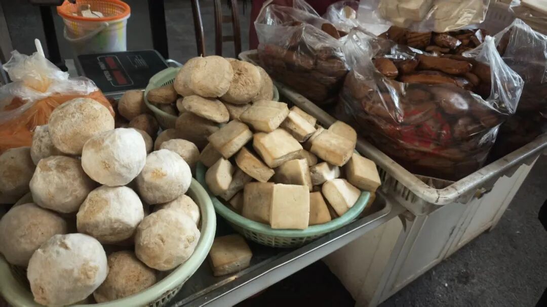 转角的豆腐摊总最热闹,竹篮里码着方方正正的阳干腌豆腐,表面泛着琥珀色油光,是经日光慢晒、粗盐细腌的醇厚。
