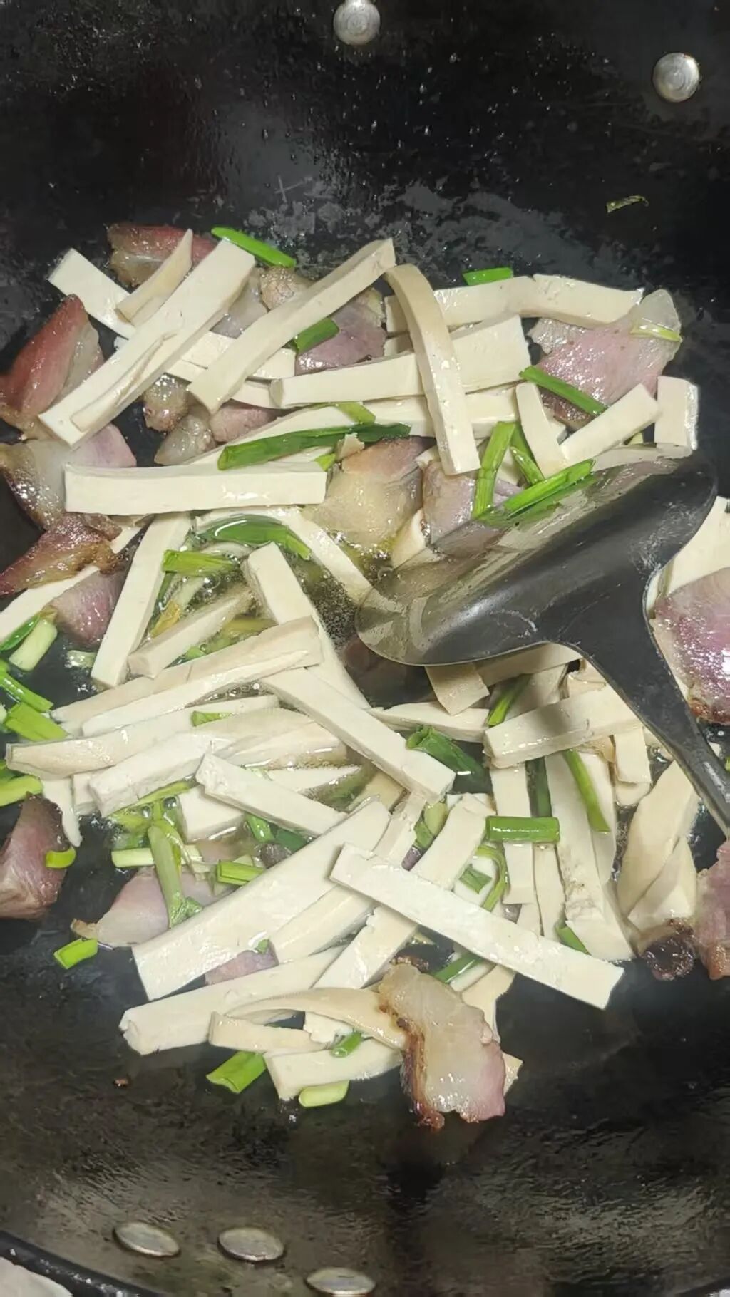 买上几块,切成细条,和腊肉焯水淘洗,再一并丢进铁锅里,切好的豆干正滋滋作响。