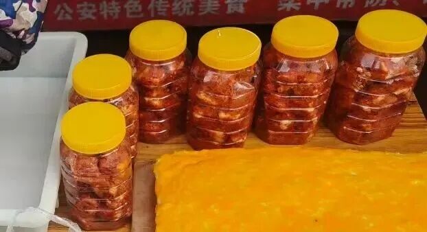 木架子上的霉豆腐更具风味,白霉裹着红辣椒粉,开盖瞬间酒香、椒香扑面而来。这可是饭桌上的常客,舀一勺拌进热米饭,绵密咸香的滋味能让人多扒两碗饭,是家家户户餐桌上的下饭神器。