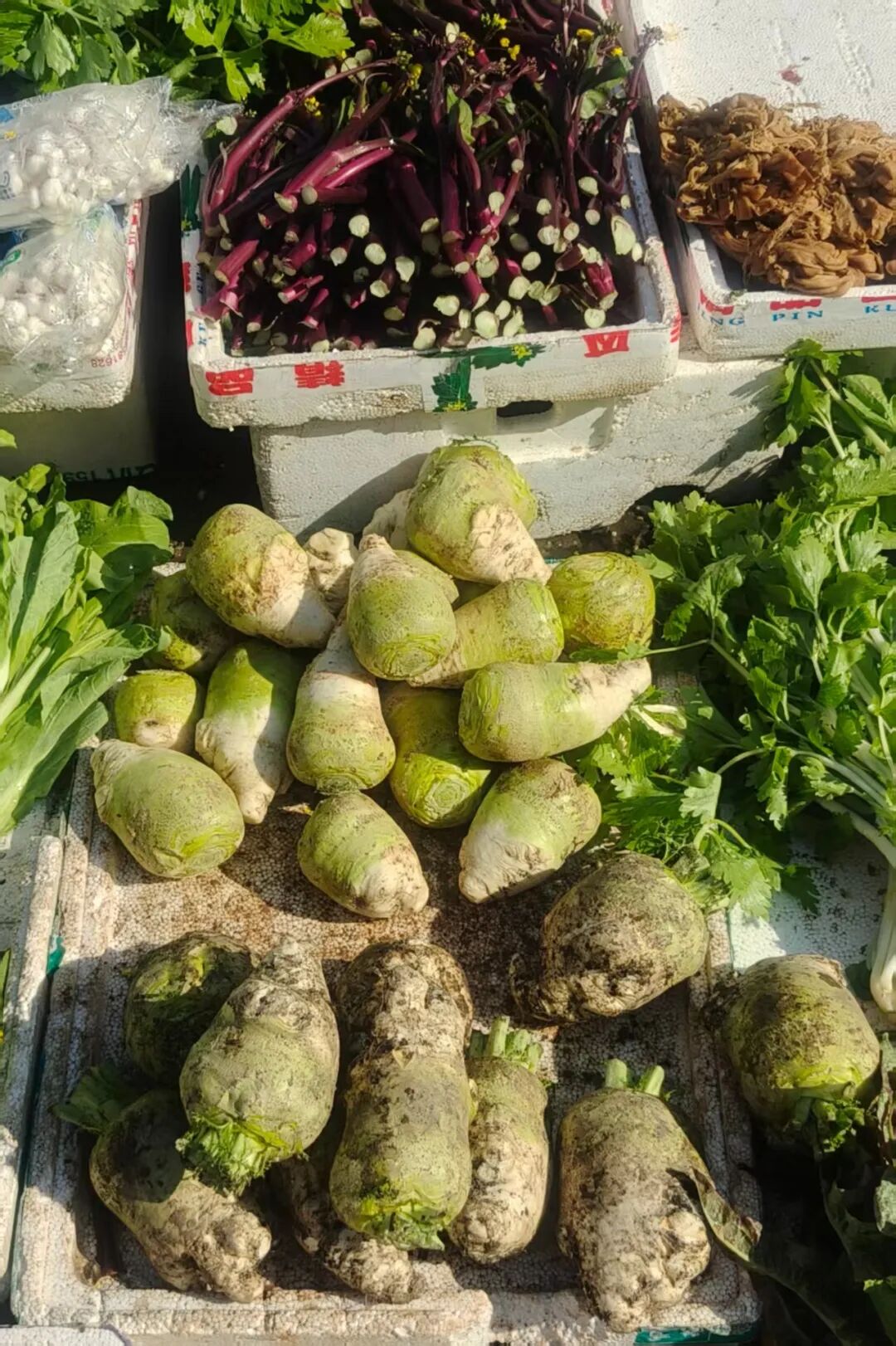 旁边的蔬菜摊也不甘示弱,脆生生的大头菜切成细丝,拌上辣椒、香油与少许白糖,爽脆开胃。