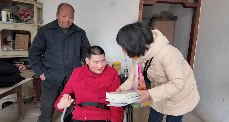 与此同时,屋子的另一角静淌着书香与温情。房县文联的工作人员陈立丽正与刘丛香的儿子汪灿一起翻看着带来的《神泉》和《房县作家作品选》等书籍。22岁的汪灿因脑瘫行动不便,说话也很吃力,但对文字却异常敏感。
