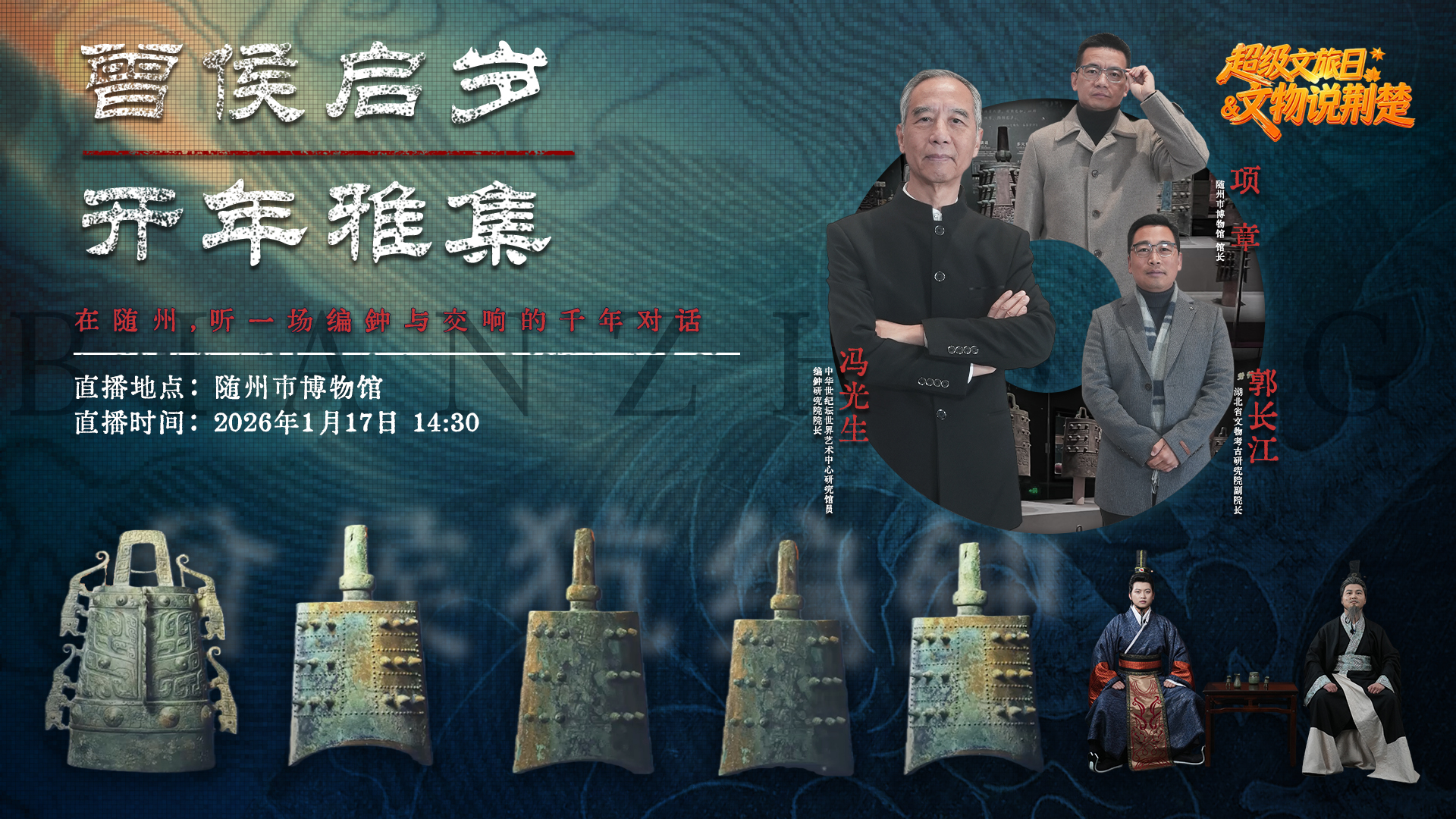 2026年1月17日,“超级文旅日·文物说荆楚”随州专场巅峰直播盛大启幕!汇聚国家级文化权威、考古专家与本土文旅大咖,坐镇焕新升级的随州博物馆,以“编钟礼乐活化”“炎帝文明溯源”“新春年味共情”为核心脉络。