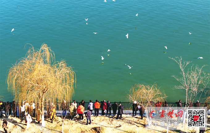 在郧阳汉江大桥南岸的牛头岭码头,市民观赏、投喂红嘴鸥。