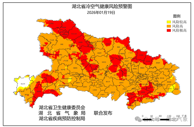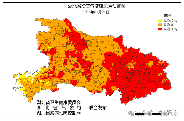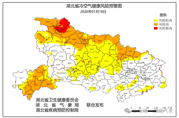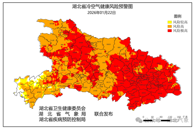 根据冷空气健康风险模型预报,18日鄂北和恩施中部冷空气健康风险高。19日至22日全省大部分地区处于冷空气健康高至极高风险区,其中十堰东部、神农架、襄阳西部、恩施局地、宜昌东部、荆门、孝感、荆州东部、天门、仙桃、咸宁、武汉、鄂州、黄石、黄冈为极高风险区。