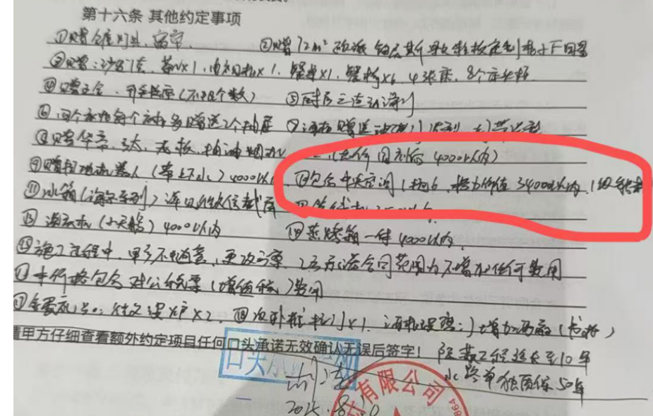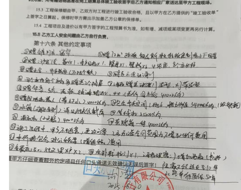 不少“全包”业主还反映,装修合同里手写项目清单中,包括柜子、灯具、电器等,已核算在“全包”费用里,给的“打包价”,但签约的时候,合同上大部分产品写的是“赠送”。