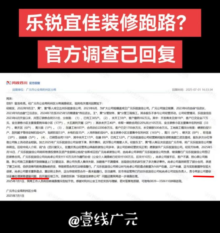 另外一家乐锐宜佳也被当地众多业主投诉“装修跑路”,在网友发布的一份官方“问政四川”的官方回复中,相关部门已责令整改。