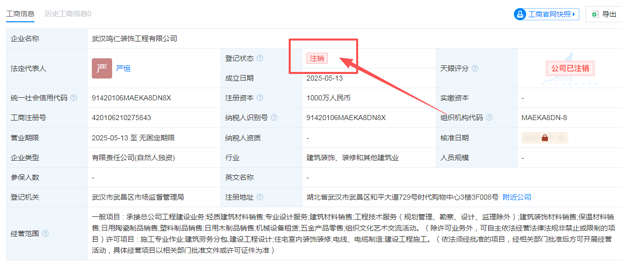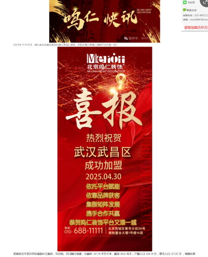 根据北京鸣仁装饰官网,武汉鸣仁2025年4月30日加盟北京鸣仁。然而,10多天后,也就是在2025年5月13日,“武汉鸣仁装饰工程有限公司”登记状态显示为“注销”。