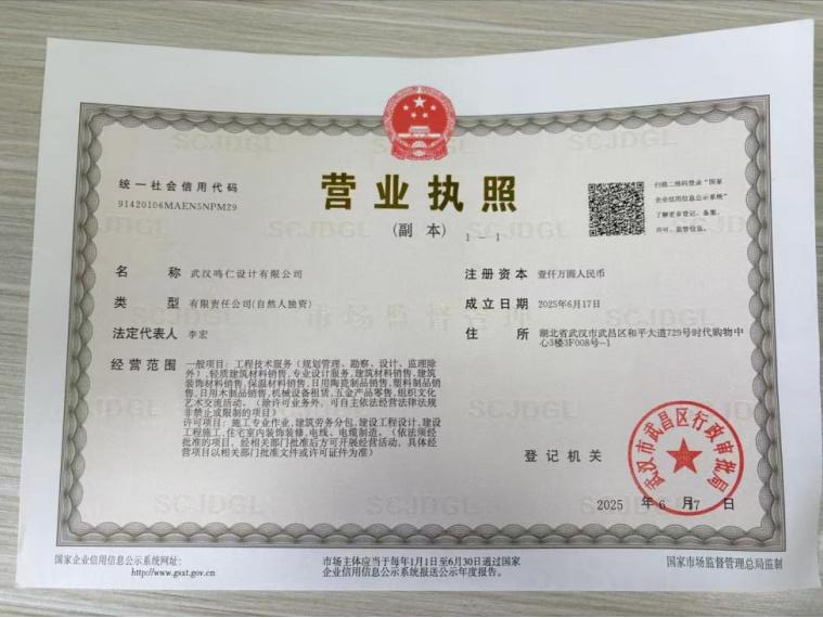 武汉鸣仁目前的“路线图”也极其相似。根据北京鸣仁装饰官网,武汉鸣仁2025年4月30日加盟北京鸣仁,10多天后“注销”。一个多月后,2025年6月17日,武汉鸣仁设计有限公司成立,注册资金1000万元。