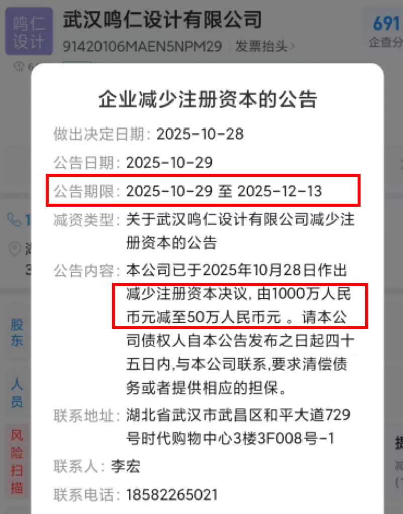 四个多月后,2025年10月28日,武汉鸣仁决定减少注册资本至50万元,减资95%。