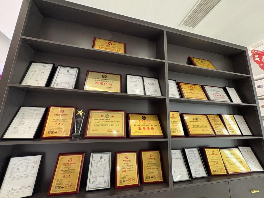 武汉鸣仁公司在三楼,在公司展厅,记者发现一面墙柜上摆满了数十块“北京鸣仁装饰”的奖牌、证书等。但是前台上方悬挂的大字为“鸣仁装饰”,而不是与业主签约的“鸣仁设计”。
