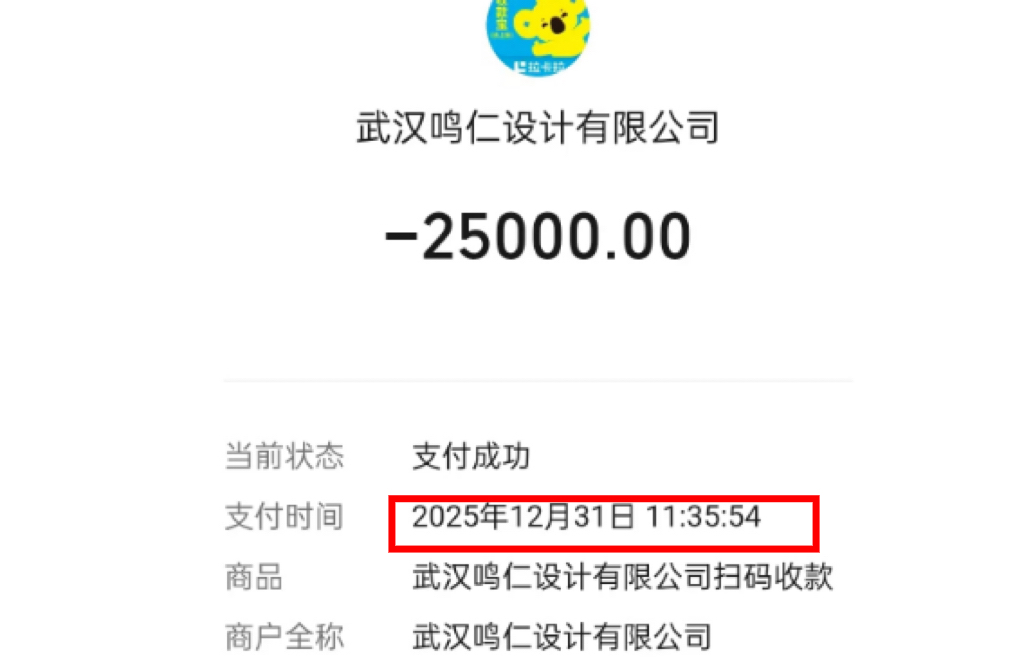 (2025年12月31日业主胡先生向武汉鸣仁支付2.5万元装修款)