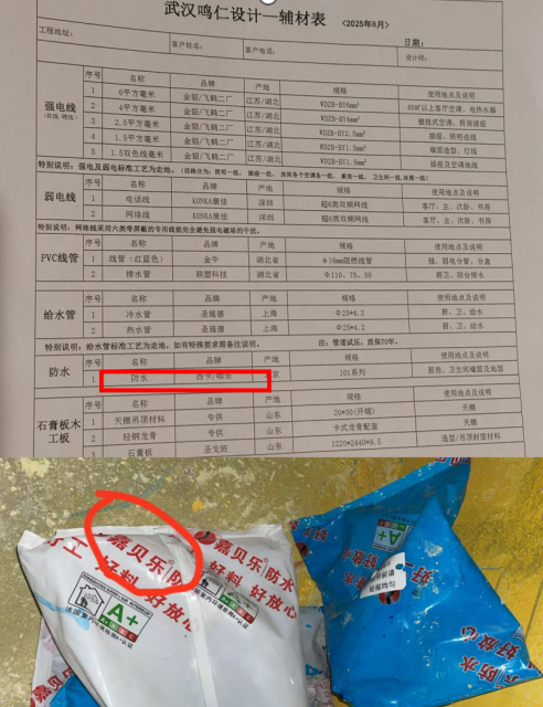 业主李女士家装修用的电线本来是2.5平方的被换成了1.5平方;防水材料合同里写的品牌是西卡,后来换成嘉贝乐。