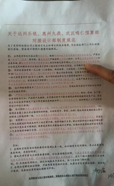 这是业主提供的一份公司文件,“关于达州乐锐、惠州九鼎、武汉鸣仁预算部对接设计部制度规范”,右下角签字的“杨瑶”,就是武汉鸣仁设计总监。武汉鸣仁与达州乐锐、惠州九鼎装饰等公司关联,疑似“同一团队”。
