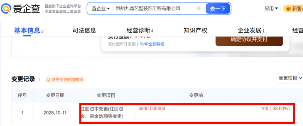 比如根据爱企查信息显示,惠州九鼎(全称为惠州九鼎艺墅装饰工程有限公司)2024年7月22日成立,注册资本为5000万元,到2025年10月11日,注册资本减至100万元,减资98%(下图)。