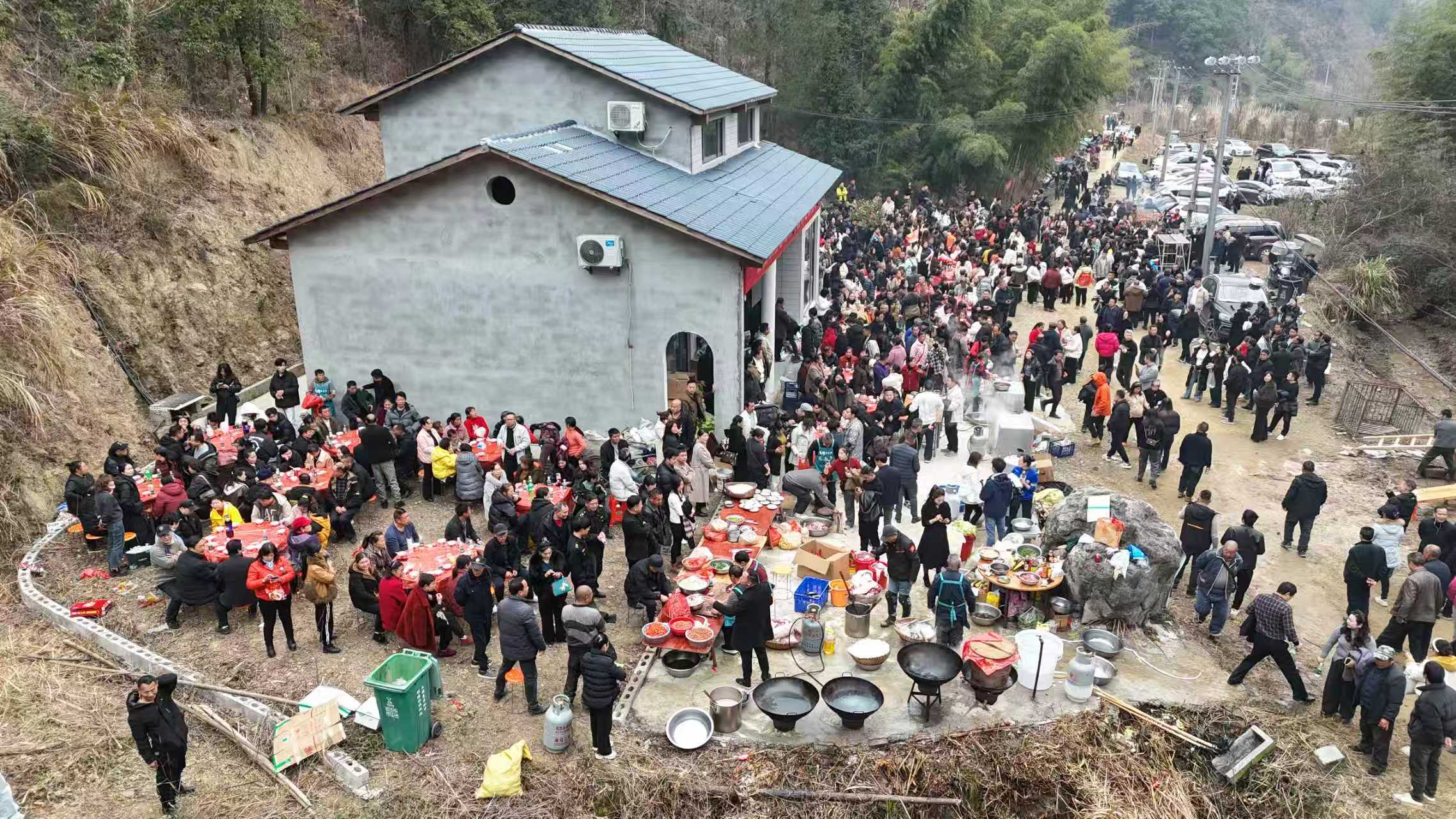 庭院之内,5口大灶齐点火,冬日干柴在灶膛里噼啪作响,火星跳跃间暖意融融。本地大厨们围灶忙碌,颠勺翻炒间,新鲜黑猪肉在铁锅中滋滋作响,浓郁的肉香混着柴火的清香弥漫在空气中,勾得人食指大动。乡邻们闻讯自发赶来搭手,择菜、切肉、端盘、洗碗,分工协作间,用最质朴的行动,共同撑起了这场跨越山海的年味盛宴。