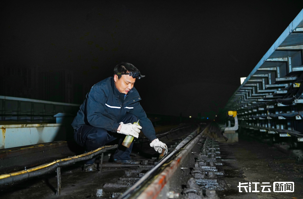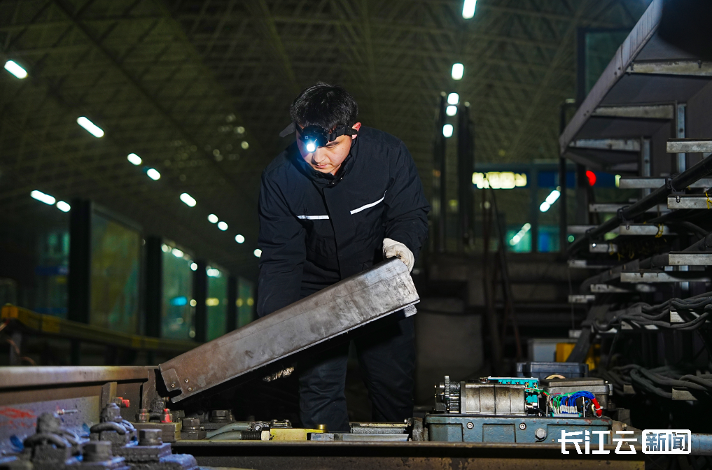 李志升和专业技工吕爽行走到道岔前,蹲在地面猫着腰,额头紧贴冰冷的钢轨,借着头灯光线查看钢轨内侧的融雪装置卡扣固定情况。“在0度以下雨雪天气中,除了加装融雪装置外,我们还在行车钢轨两侧的道岔动作杆件上加装了保护罩,以防止杆件表面结冰影响关键部位的动作。”李志升指着道岔部件介绍说。