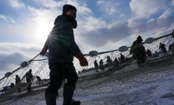 2026年1月7日,渔民们将渔网拖出查干湖冰面。