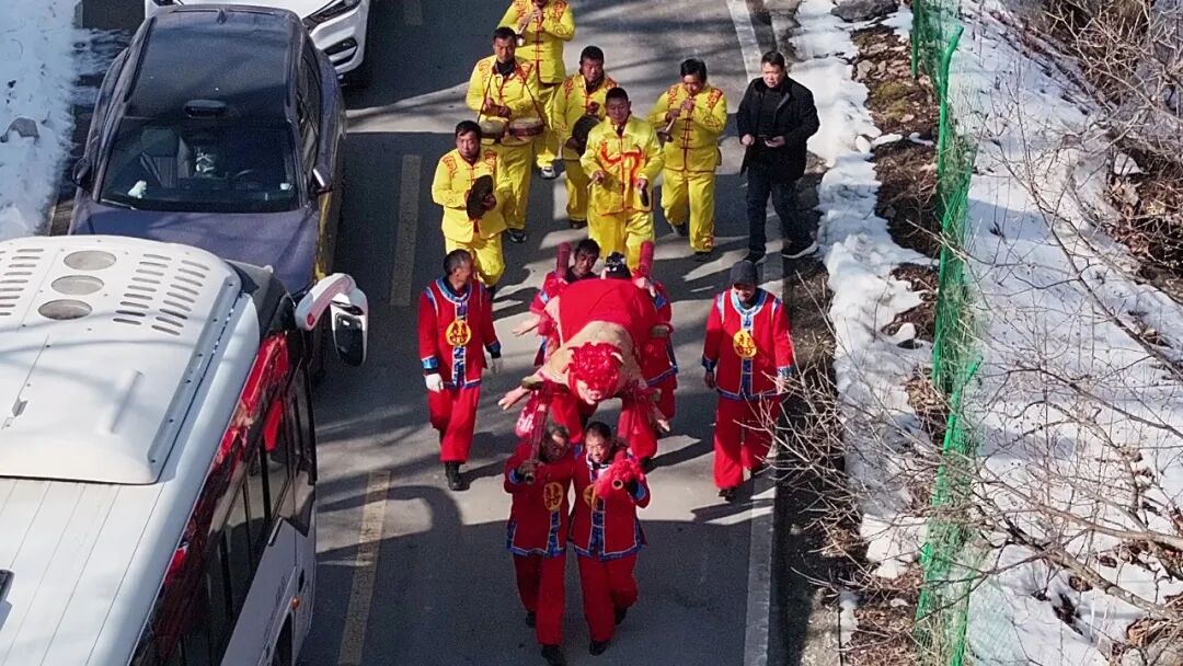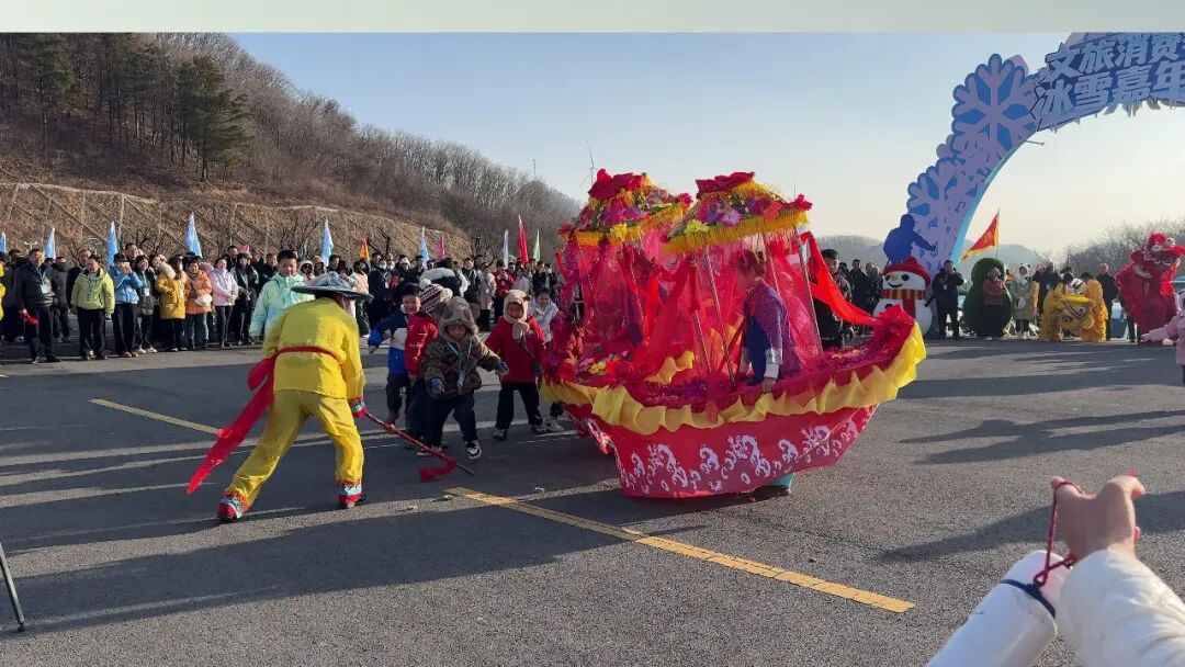 赛场之外,则是另一番红火热闹、年味十足的场景。在“欢乐过大年”民俗展演区,锣鼓喧天,金龙翻腾起舞,雄狮矫健劲跃,色彩斑斓的旱船随之摇曳,浓郁的传统民俗气息扑面而来,为冰雪世界注入了炽热的灵魂。