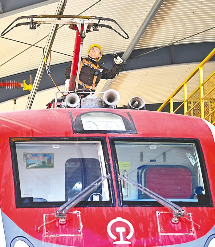 1月17日,武昌南机务段的工作人员正在机车顶棚上检修机车。 (湖北日报全媒记者 朱熙勇 通讯员 唐珂欣 摄)