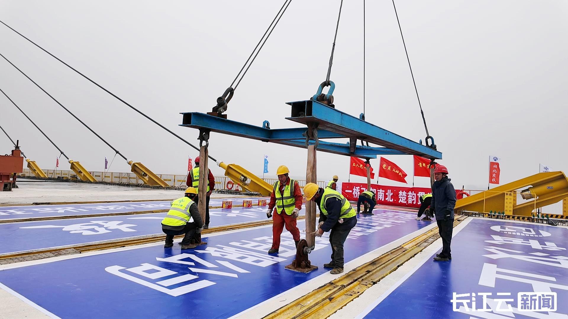 “松滋河特大桥合龙过程中,温度对钢梁线型有影响,精度控制有一定难度,项目团队采用了顶推装置进行顶推合龙。”中交二公局当枝松土建四标松滋河特大桥现场技术员耿万松介绍道。