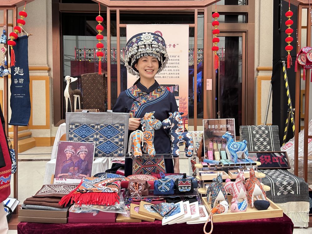 非遗焕新之魅力,不止是各美其美,还在于美美与共的创新融合。在土家织锦西兰卡普摊位的一角,摆放着一款文创香礼盒——外盒是精致的西兰卡普纹样,内里是传统合香产品。