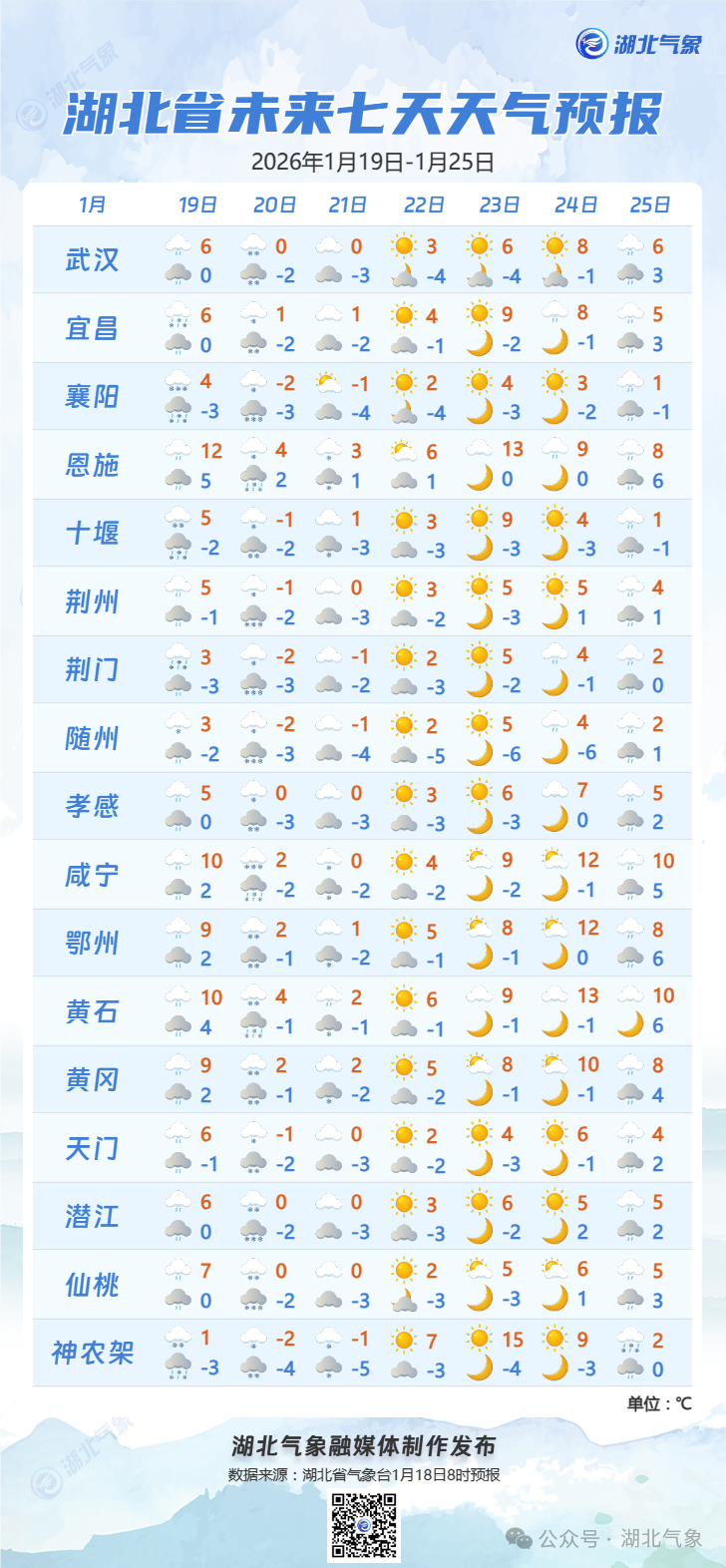 预报来源:湖北省气象台2026年1月18日16时预报
