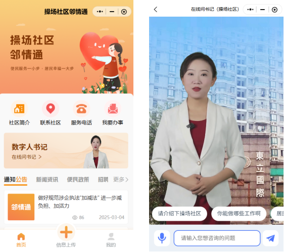在操场社区,AI数字人成为居民身边的“全天候暖心管家”。依托前沿技术,数字人搭建起社区与居民的亲密联结,无论是政策咨询还是民生事务办理,都能获得及时且专业的回应。那些重复性的咨询工作由数字人承接,让社区工作人员能集中精力处理更复杂的事务,既提升了服务效率,更拉近了与居民的距离,稳稳打通便民服务的“最后一米”。