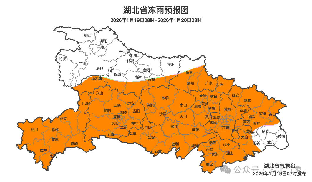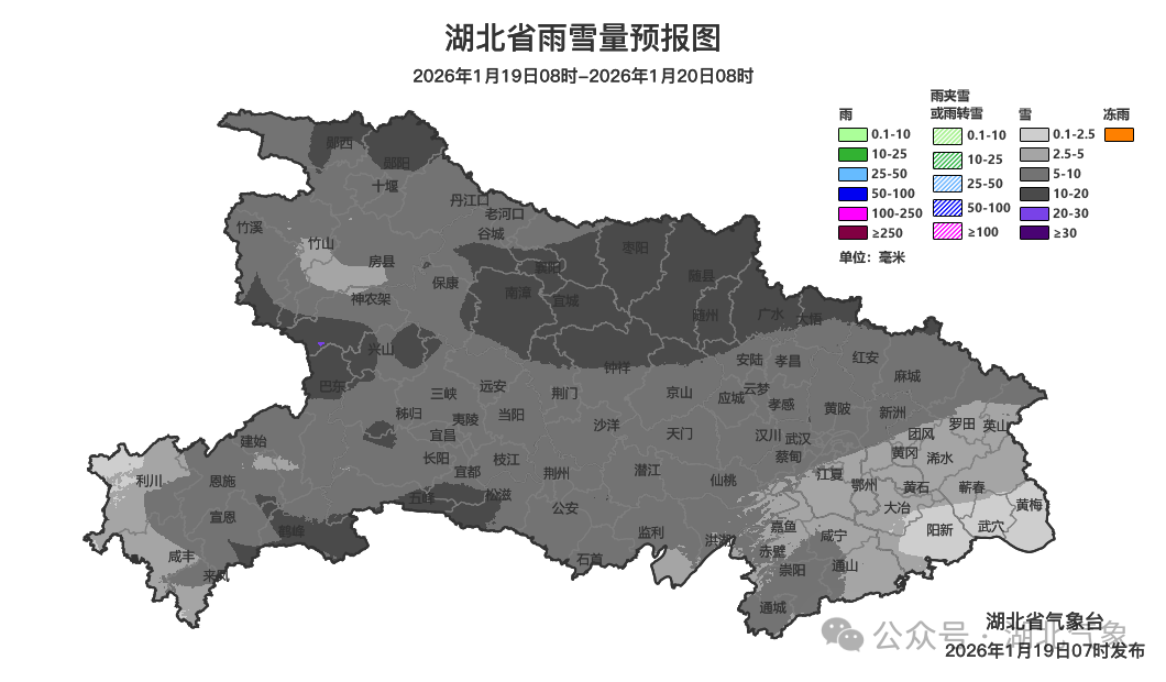 1月19日08时-20日08时,鄂西北、鄂东北西部阴天有大雪到暴雪;鄂西南东部、江汉平原、鄂东北东部小雨转中到大雪,局地暴雪;其他地区小雨转小到中雪,局地大雪。全省大部分地区有冻雨或冰粒。最高气温鄂西南、鄂东南3~8℃、其他地区-1~3℃,最低气温北部-6~-2℃、南部-2~1℃,偏北风4到6级、阵风7到9级。
