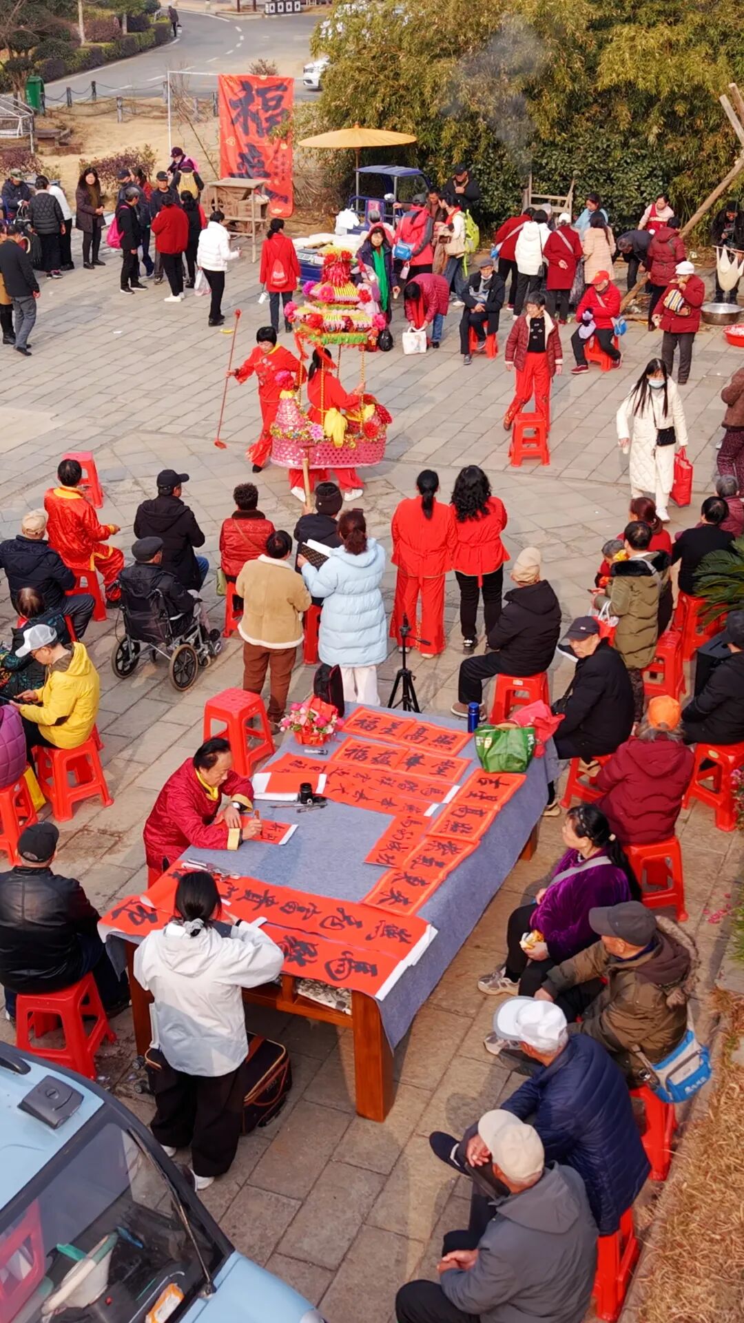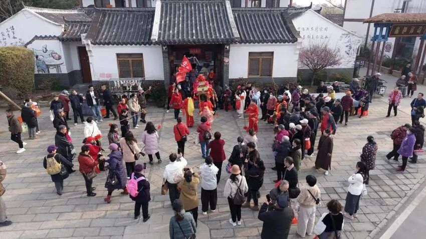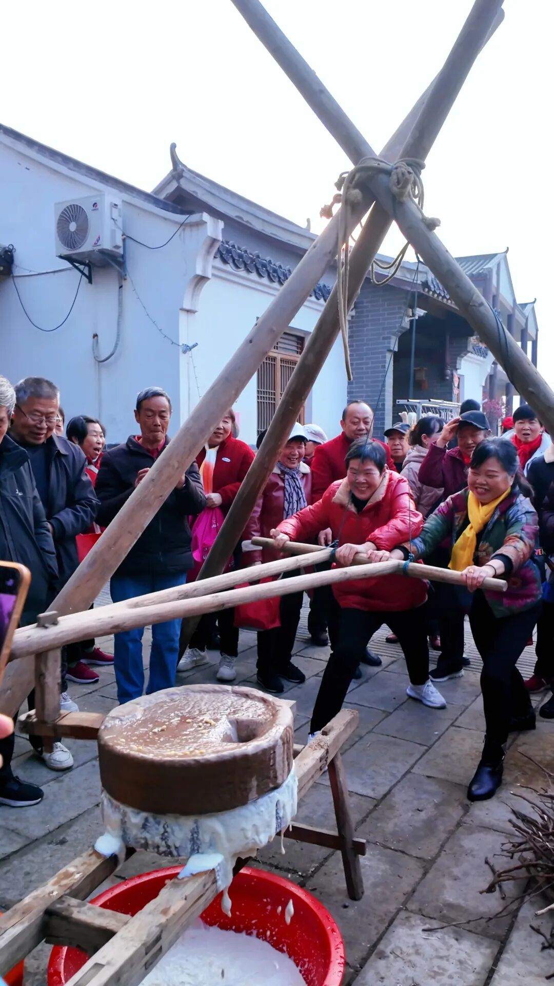 厨房备宴间隙,李白村的文化大戏率先开场。非遗表演《采莲船》热闹上演,彩衣舞动、锣鼓喧天,与游客欢乐互动。一旁的民俗体验区,打糍粑的号子声与石磨豆浆的香气交织。年猪的头部更是由村民游客自发抬起,披红挂彩巡游古村,让“抬猪纳福”“年年有余”的美好寓意在欢快的气氛中流淌。