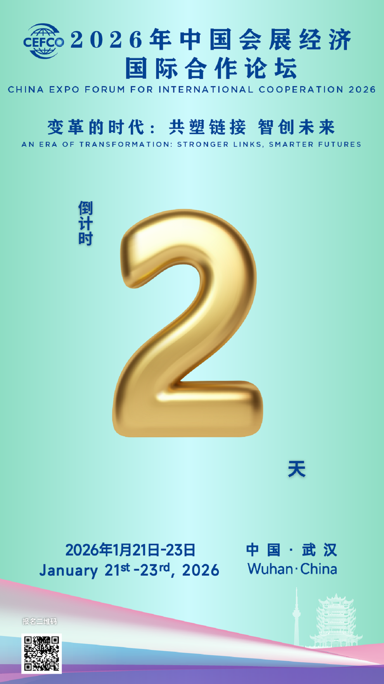 倒计时2天!2026年中国会展经济国际合作论坛(CEFCO 2026)将于2026年1月21日至23日在湖北武汉举行,本届论坛由中国贸促会与国际展览业协会、国际展览与项目协会、独立组展商协会和国际大会及会议协会4家会展业国际组织共同主办,武汉市人民政府承办,以“变革的时代:共塑链接 智创未来”为主题,汇聚全球多个国家和地区的会展界人士共话行业发展与国际合作。