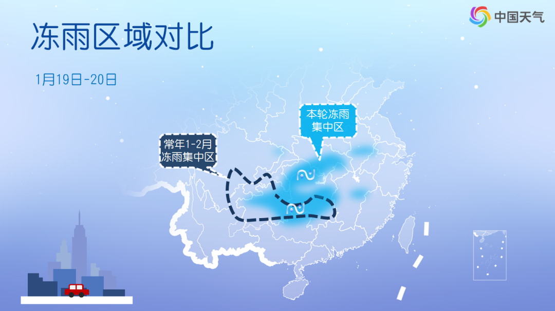 与常年1月至2月的冻雨集中区域相比,此次冻雨范围偏大。19日至20日为冻雨影响最集中时段,19日,冻雨将主要出现安徽中部、湖北、湖南西北部,20日,贵州、湖南、江西等地还有范围不小的冻雨。