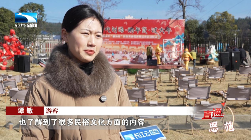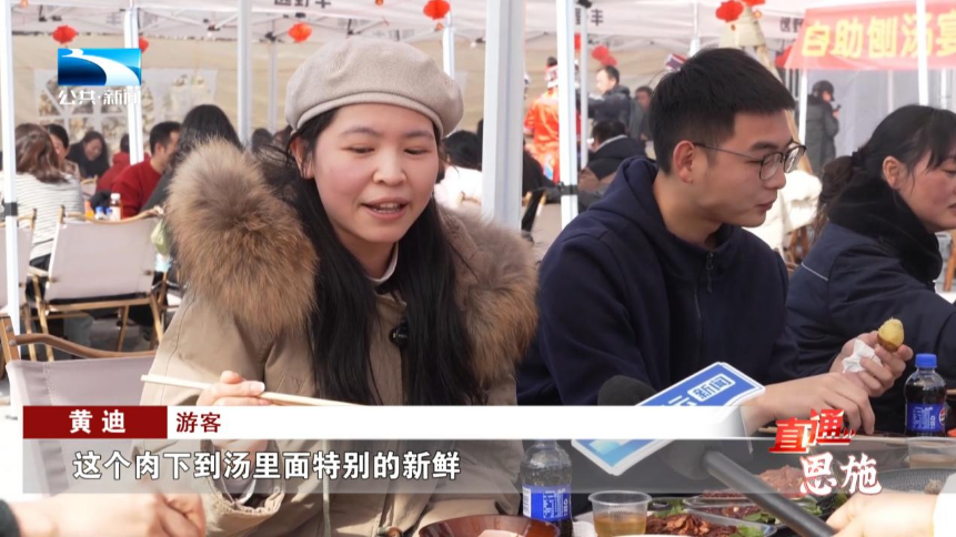 恩施州建始县业州镇金建社区党总支书记 王兰平:一起品尝刨汤宴,提前感受到年味,也是通过这种方式,展示了我们的土家族民族文化,让游客实实在在的享受到优惠和实惠,推动了我们当地的经济发展。