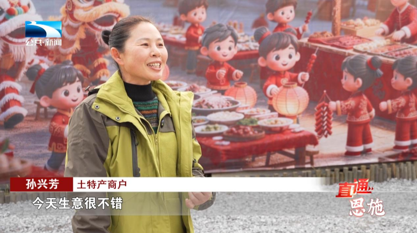 土特产商户 孙兴芳:今天人特别多,我们摊位上就卖了1700 1800块钱,今天生意很不错。